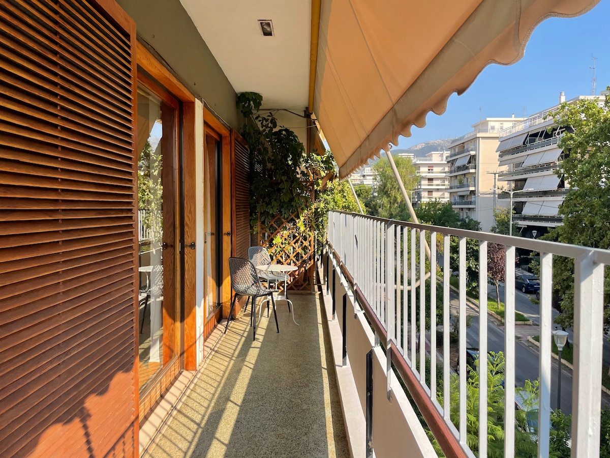 The modern renovated 60m2 5th floor penthouse apartment is located just 4-min walk away from the metro station Panormou on the airport line, an ideal quiet 'basecamp' for Athens exploration! Carefully designed and decorated by me as an architect, the apartment is fully equipped with everything one wishes, two smart TVs (in bedroom and living room) and a cute fireplace corner. Two huge balconies with plants in both sides with stunning panoramic view to the city and Ymitos mountain. Enjoy!