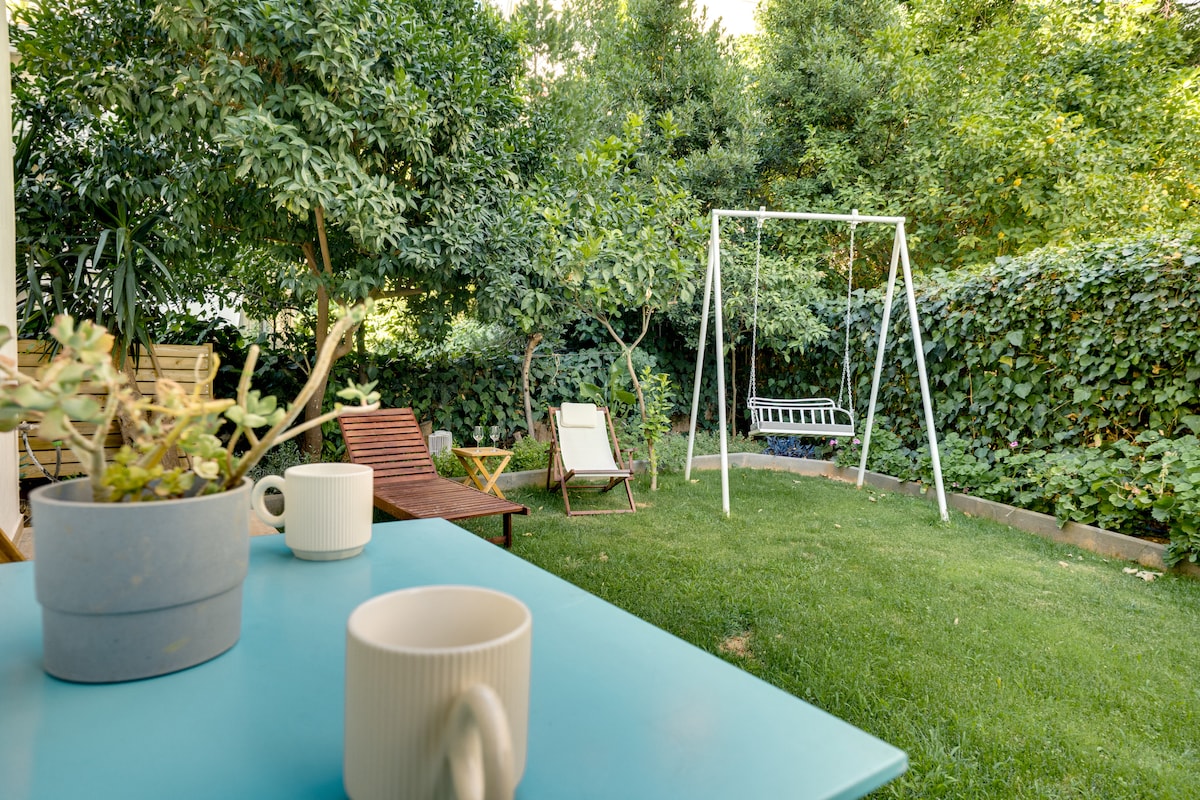 Begin the day with breakfast in the dappled shade of a flagstone terrace surrounded by potted plants and mature trees. Entertain company in a spacious living room with plenty of seating and a sound system, and cook meals in a family size kitchen. This property is completely independent and has no common areas with any other apartment In response to Coronavirus, additional safety and sanitation measures are currently in effect. Before a new arrival we disinfect all surfaces with a certified disinfectant, and steam cleaner. We are very close to the hospitals Ygeia, Mitera, IASO, IVF Embryogenesis, ecc. As we live on the 1st floor of the building, we are easily in contact to help with everything you need. We are available any time to answer your questions and we can provide you with great choices that would make your stay as comfortable as possible. Guests have access to all the parts of the space, such as the living room, kitchen, bathroom, 2 bedrooms and of course to the garden. Hosts Profile: We, Akrivi and Dionisis, live on the first floor of the same house. We own 2 jewelry galleries and a work shop in the center of Chalandri and in the island of Paros. We have two daughters which are 25 and 18 years old. We are Eco Friendly, cat lovers and garden lovers ( three cats live in the garden).We love hosting and we find it a very interesting experience! Chalandri is a green, safe, and trendy area in the north of Athens, full of shops, restaurants, and coffee bars. The apartment is on a quiet side road, but is close to the center of Chalandri and only 12 minutes by metro or bus from the city center. A 24h/day mini market is just a few steps away. Most of the biggest private hospitals , such as HYGEIA,MITERA,IATROPOLIS,EMBRYOGENESSIS,IATRIKO KENTRO, are in less than 2 km.far from the apartment. Bus stop and Electric Bus Stop in 200 meters from the house. Metro station (Holargos) 1250 meters from the house. Parking place in front of the house most hours of the day. In five minutes walking from the house you will find: 1)Restaurants : Mediterannean restaurant (310 m), Traditional Greek grill (suvlaki) (350 m), International Bistrot (280 m), Japanesse restaurant (340 m), Burger House (290 m), and more 2) Coffee shops : Starbucks(380 m), Coffee way (340 m) and more Bars 3) 24 hours service: Food mini market (160 m), Mc Donalds Fast food (820 m) 4) Super market and all kind of food shops, bakery (290 m), grocery (290 m), bucher (290 m),fish (350 m), wine and spirits (660 m) etc. 5) Organic Food market (540 m) 6) Farmacies (320 m) 7) All Greek Banks – ATM (200 m) 8) Technology shops (Vodafone and more) (420 m) 9) Fitness Club (you may pay by day or week) (630 m) 10) Cinema (and the greek style cinema in terrace during summer time) (340m) 11) Open area park for walking and running training (980 m) 11) Bus stops, with many bus lines, to all directions in Athens (250 m – 340 m) 12) Public kindergarden (600 m) In less than two kilometers from the house (five minutes by bus or 30 minutes walking) 1) Metro station (Holargos), distance from the house 1250 m.(15-20 minutes walking). In seven minutes from Holargos station you arrive to the station Syndagma, the center of Athens. 2) The center of Halandri with hundrends of shops, bars, restaurants, street food, fashion and art shops. Distance from the house 1700 m, 25 minutes walking. 3) Most of the embassies in Athens (more than 30 embassies) Canadian (630 m), Japanesse (650 m), Russian (400 m), Swiss, etc. 4) Amost all the big private hospitals and clinics in Athens (Iatrikon (3700 m), Ygeia (1700 m), Mitera (1800 m) etc) 5) The most well known private school in Athens, American College of Athens (590 m), Arsakion (630 m), Moraiti (1100 m)