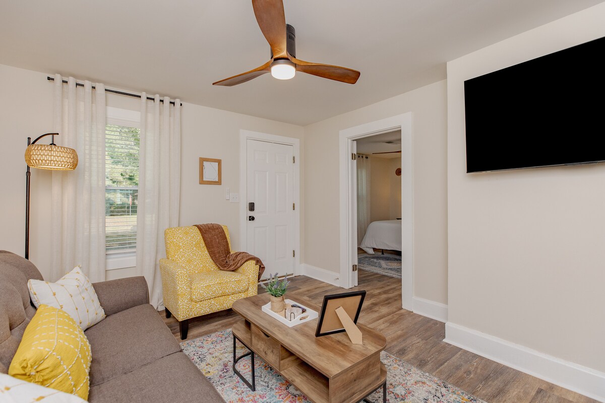 This adorable farmhouse experience is secluded but conveniently close to historic cities. Boasting in rustic charm, the upstairs of this barn has been renovated to include 1 bedroom, 1 bathroom, kitchen, and living room with a pull out sofa bed. The property features a vast open field, a private garden, fire pit, southern home, and animal pens housing goats and chickens. Breakfast items provided including farm fresh eggs and muscadine jelly from the garden! A truly wholesome southern experience.