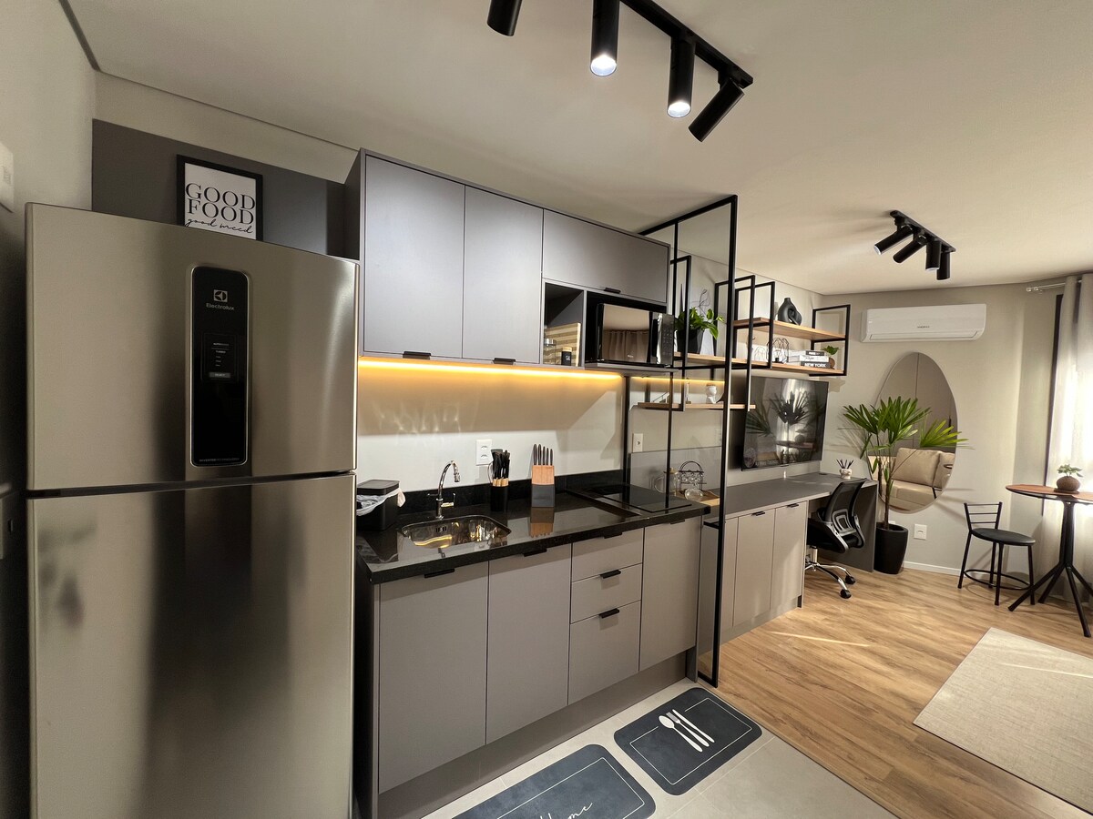 Brand new loft, newly built on the fourteenth floor. Rooftop on the seventeenth floor. Located in the best neighborhood of Pelotas, the Una park offers an incredible experience. Safe place, physical activity, nature. Charming and perfect for couples, the loft is designed with refined sophistication. The space Queen size bed with massage, hot water faucets, LEDs, sofa, two swivel armchairs, smart TV, Netflix, laptop counter, full kitchen, steam iron, hairdryer
