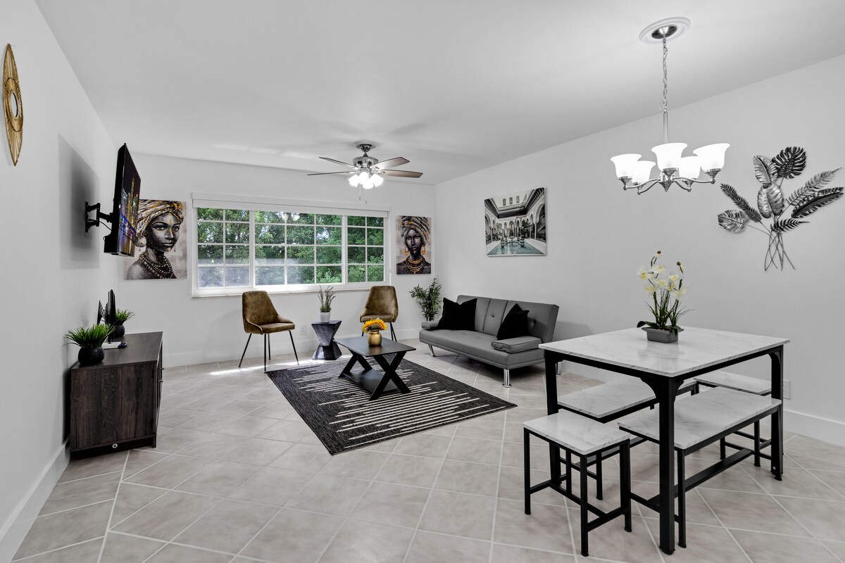 This is a newly renovated mid-century modern retreat in the heart of Pembroke Pines. This comfortable studio is ideal for short term stays, featuring a full kitchen, a beautifully updated bathroom, and a spacious living area. Unwind in a comfortable queen-sized bed and a futon that opens up to a double bed. Includes complimentary coffee, toiletries, fast WiFi, and a smart TV with streaming apps. Immerse yourself in comfort and style in this inviting space in vibrant Pembroke Pines.
