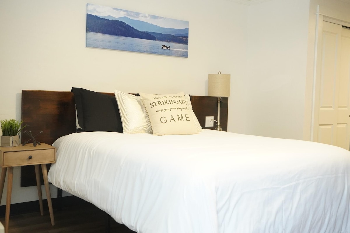 Freshly remodeled (2022) mustang themed room at Lake Village Lodge. Convenient location, near downtown festivities and close to the freeway entrance for quick access to all the mountain, skiing, lake, river, and hiking CDA and the surrounding areas have to offer! This room has a queen bed and futon, So this can comfortably sleep 4. Great home base for all your Coeur d'Alene adventures. If you need more space, check out our suites and room 6 & 7 at Lake Village Lodge.