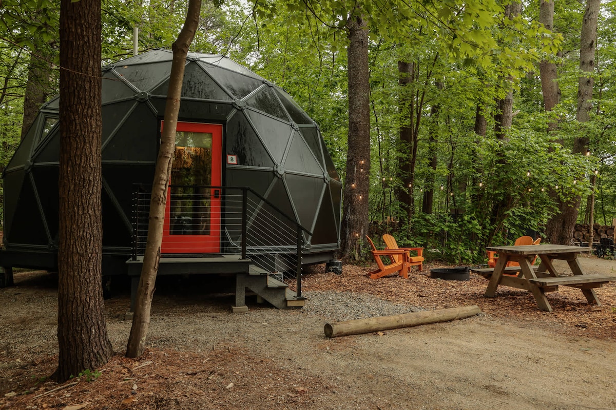 The Streamside Getaway offers a luxurious glamping experience in a new solar and wind-powered Geodome. Equipped with custom furniture, new hot tub,luxury appliances, free high speed wifi, AC/Heat Unit and modern bathroom and kitchen facilities, guests can enjoy a homely and comfortable stay in nature. A glamping site built in 2022 offers a contactless check-in process with a custom key code. Additionally, we have added archery, axe throwing, and kayaks to enhance your outdoor activity!
