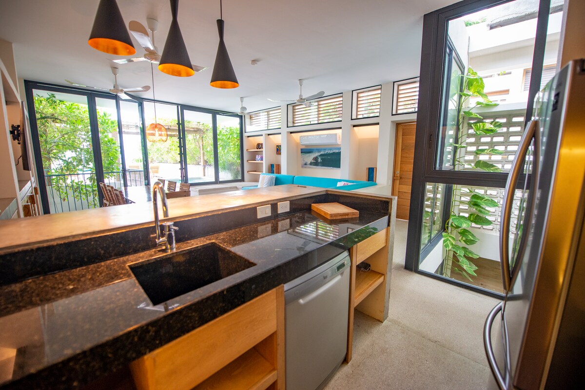Welcome to Casa Shanti! This luxury Apartment has everything you need! Star link internet - Most reliable in Town. Fully equipped kitchen with: Blender, coffee maker, big fridge, great Gas burners. Plus- A small private terrace with your own hammock 24/7 Cozy and practical bathroom With hot water and great water pressure. Exotic wood design everywhere + AC OUR location: walk 1 minute to the beach. OR join our movement and Yoga classes! BOOK NOW Note: possible construction work nearby