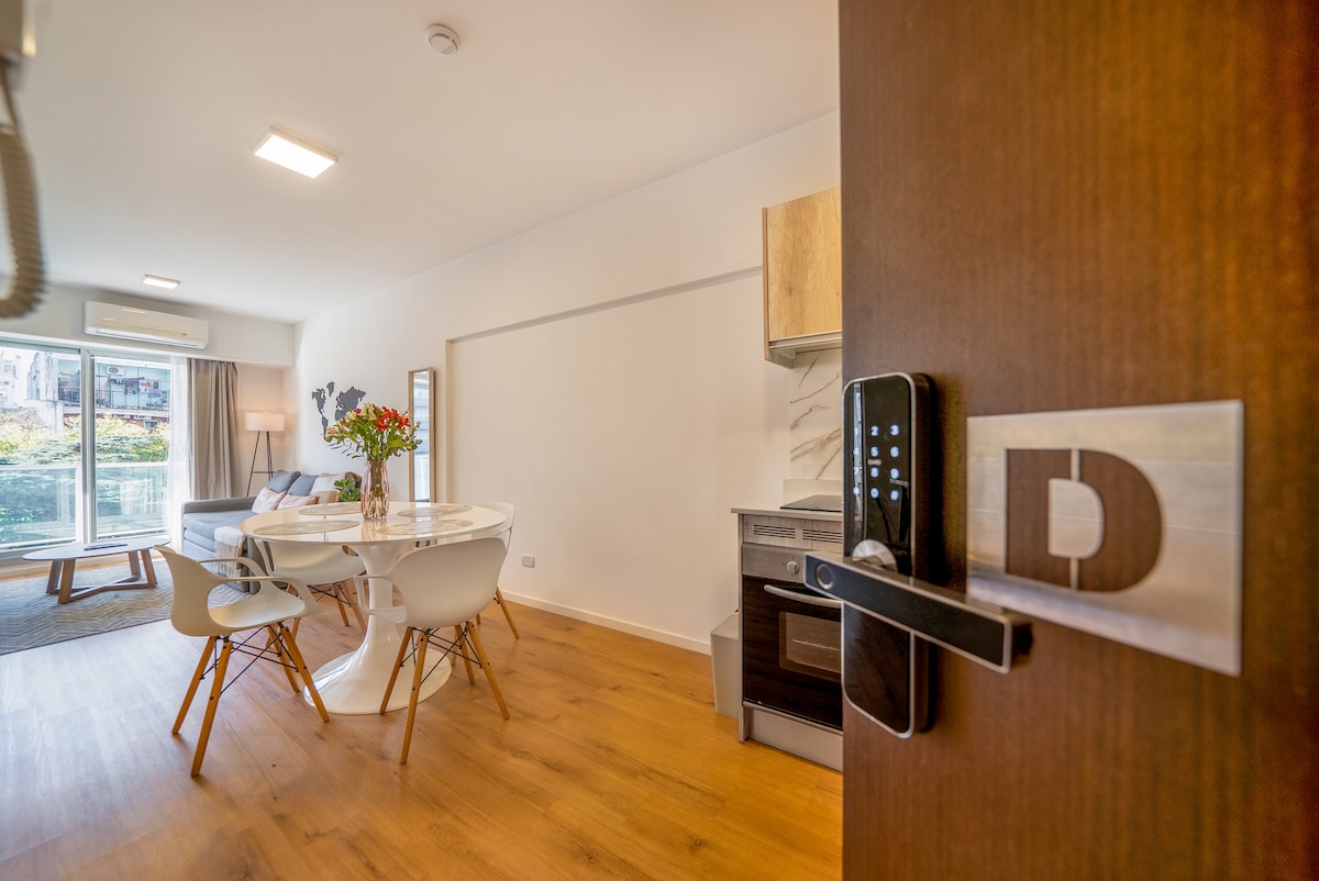 Beautiful brand new studio, fully furnished with excellent quality equipment -TV 32' with cable/Netflix, WIFI 100 MB, A/C hot-cold, King Size bed, desk, full kitchen, -in a Hotel style building with 24 Hs security, swimming pool, Gym, laundry. Located in the heart of Palermo Soho: 200 mts. from subway D/Plaza Italia (Santa Fe Av.), close to stores, bars, restaurants, shopping malls, parks, museums and with easy access to downtown and many touristic spots!