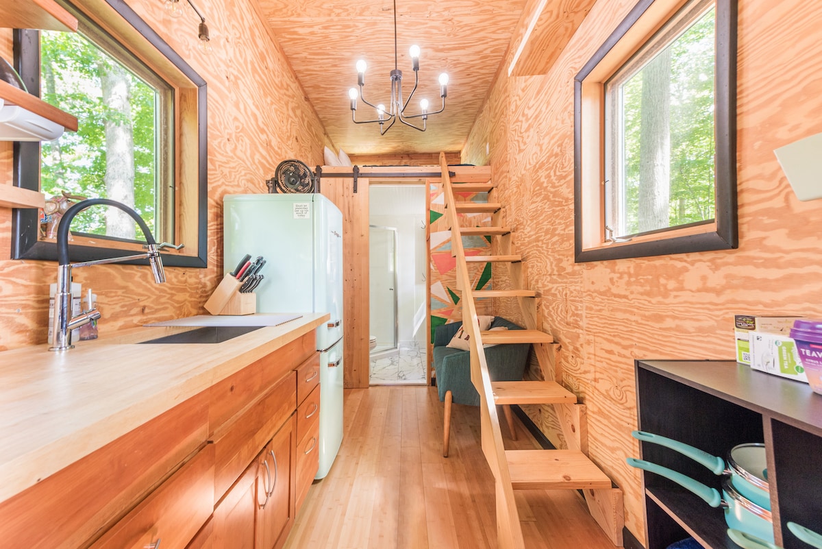 Reconnect with nature at this unforgettable escape. Sitting on the back side of beautiful 5 acre property, tucked in the woods along a beautiful lake. The Hosts home in on the property Come stay and unwind. Plenty to explore and just be. Lake access for swimming or with paddle board, canoe, or kayak. Just ask and can be assisted with. The whole property has been curated to be a magical oasis. Full bathroom inside Brand new Mini Split heat and AC unit. Has most kitchen amenities