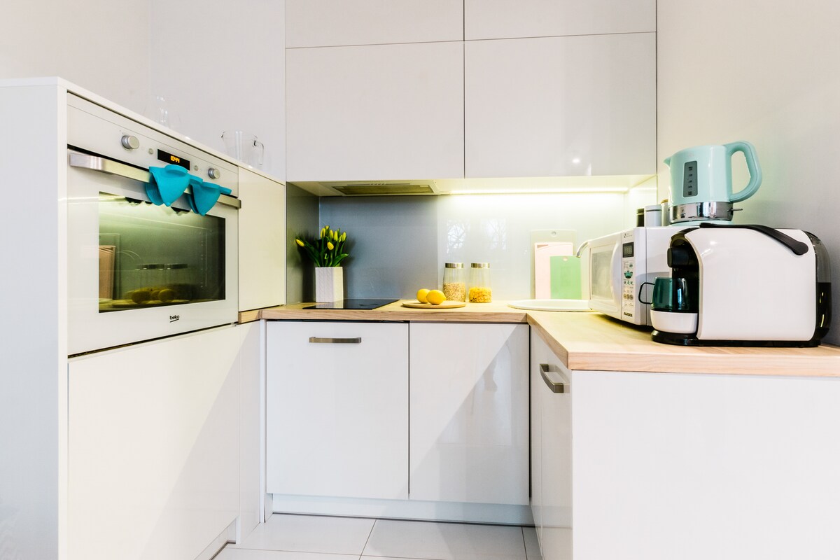 Very nice apartment. There is a kitchen with a living room, bedroom, bathroom and a balkony. Behind the building there's a small forest as well as a nice park. Around 200 m from the appartment there's a shopping mall and a cinema. For guest use there`s a undergrung car park with dedicated place. In the kitchen for comfort f guest there are basic kitchen staff like coffee, tea, sugar, salt, oil, spices etc... Night silence applies between 22.00-06.00 so it`s not adequate for parties.