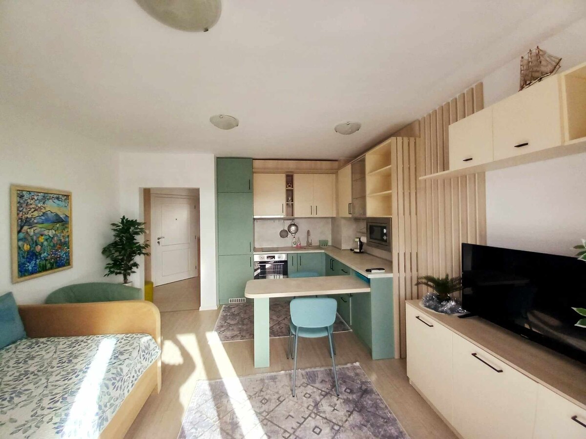 🌅 Location and Atmosphere - The apartment is conveniently located within walking distance of the city center and the sea garden! 🏠 Apartment Tour: - Bedroom with 2 wardrobes. - Bathroom with toilet. - Dining area with a kitchenette equipped with a refrigerator, stove, coffee machine, kettle, and everything needed for a household. - Sofa bed suitable for sleeping. - Spacious terrace ideal for spending your free time. ⭐️ The apartment is equipped with everything you need for your stay!