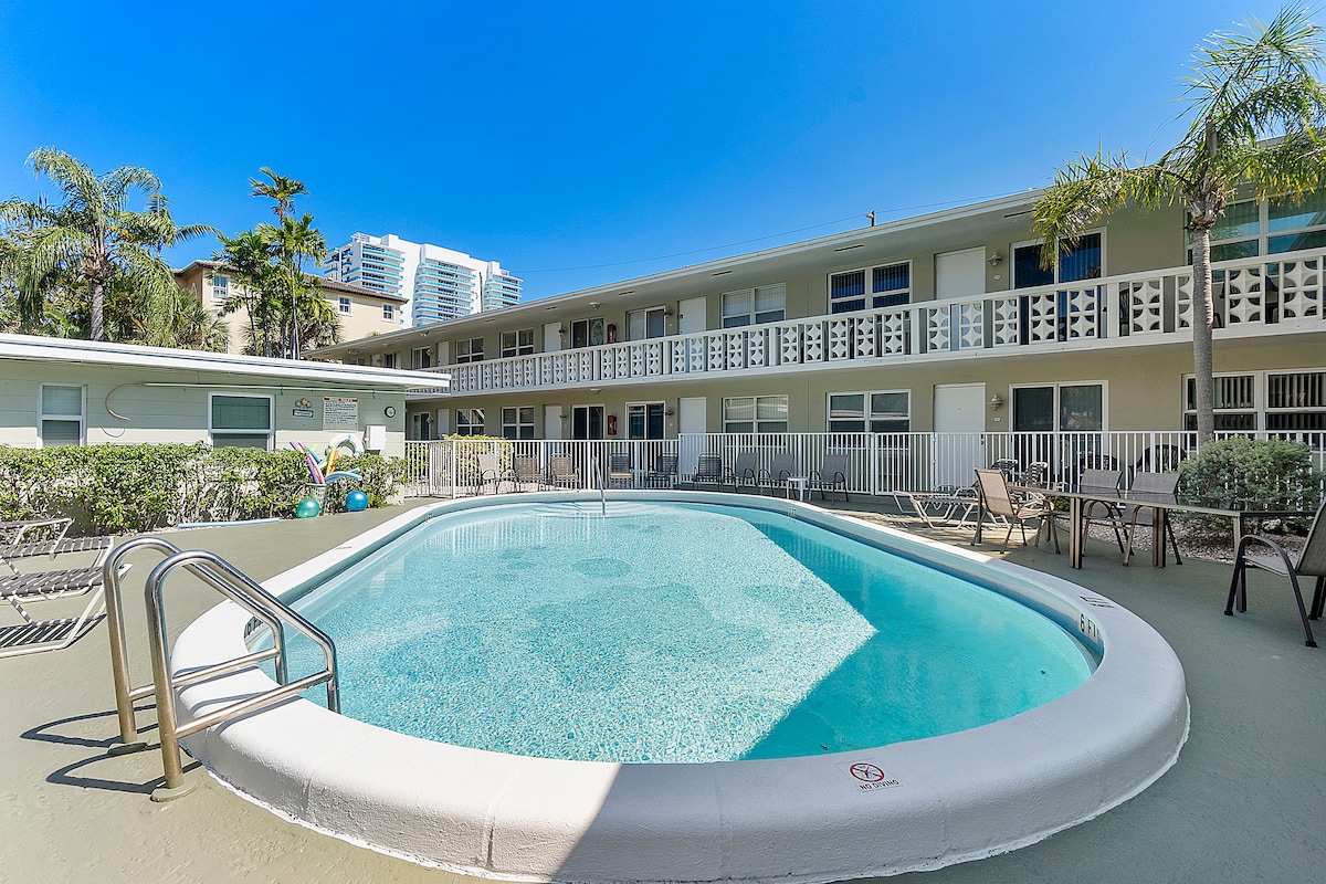 The Buccaneer-Ocean Drive(A1A) on the Island.Newly Renovated-beautifully furnished clean unit comfortably sleeps4(King or2 Twin beds &Queen sleeper)Full kitchen,heated pool,onsite laundry, free parking w/no need for car as beach,groceries,shops,nightlife &dining(12+)all within 1 Ocean side block along DBI’s award winning"Blue Wave"Beach. Rated one of FLA’s cleanest beaches! Steps to the viewable ocean scenery,fishing pier and mile of brick paved beachside walking under blowing picturesque palms.