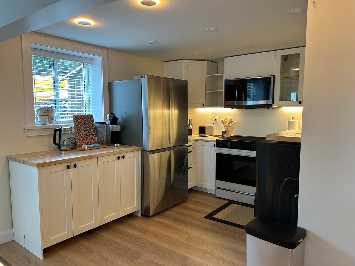 Spacious 900 sq ft private king suite 5 min to BC Ferries & hospital. Full kitchen, bathroom & in-suite laundry for easy longer stays. Large living room with extra sleeping space. Quiet area backing onto green space with big yard & fire pit (wood included). Pet friendly 🐾 (because trips are better when the whole family comes) 15-min walk to town, restaurants & parks. Perfect for traveling nurses, medical stays, ferry stopovers, or anyone needing a calm, comfy place to relax and unwind.