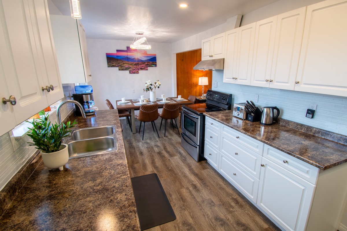 Enjoy your "home away from home" at the Red Roof AirBnB. This beautiful, clean, and welcoming space features 2 large bedrooms, a brand new quartz kitchen equipped with the essentials, and a 5-piece bathroom with a double vanity. The Red Roof is conveniently located within walking distance to Prince Rupert's quaint downtown area, offering a variety of shopping, entertainment and dining spots! Come home to ample street parking, comfortable beds, private laundry facilities, and a quiet workspace!