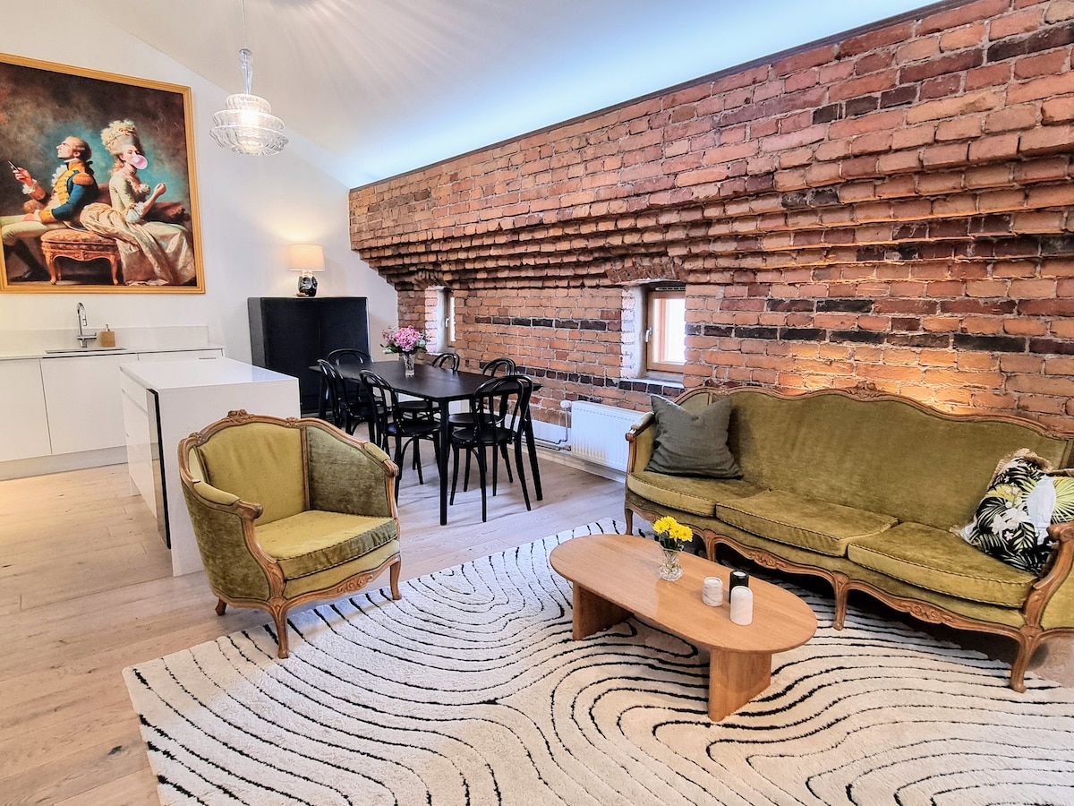This furnished spacious studio apartment comes with warm colors and a fully equipped open layout kitchen. This studio is well suited for short and long term stays with a spacious layout, large Jugend-style windows, and plenty of closet space. Get the practical things like a fully equipped kitchen, washing machine, fast WiFi, 24/7 support, and regular professional cleaning, and fun stuff like a smart TV. Stay in comfort for as long as you’d like – days, weeks or months.