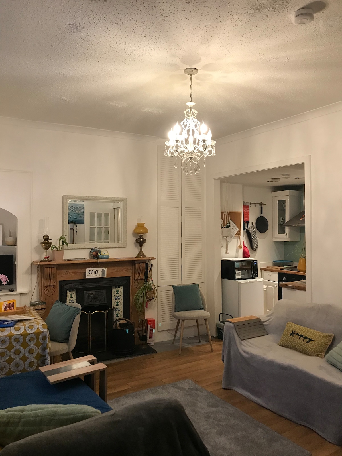 Spacious garden flat with its own entrance, which is per garden off Belhaven Terrace Lane, postcode G12 9LZ). The cobbled lane has street lighting, a number of mews cottages and is widely used especially during the day. Living room/ kitchen has full cooking facilities as well as washing machine and iron/ board. Bedroom is split into main area and alcove with a mattress on floor, could be used by 3rd person (eg child) by agreement.