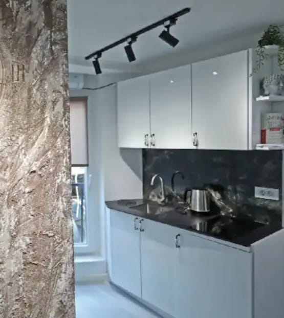 Located in the very heart of Prishtina, directly in the main city square, this apartment sits in a fully walkable, pedestrian-only area with no car traffic. Cafés, restaurants, bookstores, and cultural spots are all just steps away. As expected for such a central and vibrant location, the surroundings are lively, especially during the day and evening. The apartment features a smartly designed kitchen that can transform into a living area, with deep, rich tones creating a warm urban atmosphere.