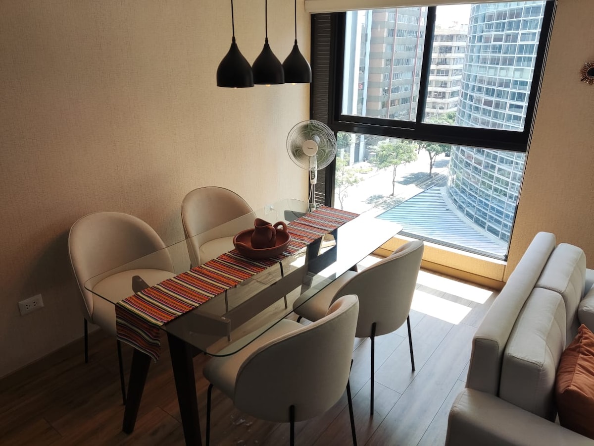 **Brand new apartment. Most central area of the city, steps from San Isidro** 100% equipped, beautiful common areas such as gym, terrace, rooftop grills, spectacular view. Centrally located and perfect for getting around Miraflores, Barranco, Lima Centro. Close to malls, entertainment venues, and restaurants. 8th floor of a modern 25-story building, with wifi. Fully equipped kitchen, bathroom and a bedroom with a queen size bed. Entry with key and smart lock