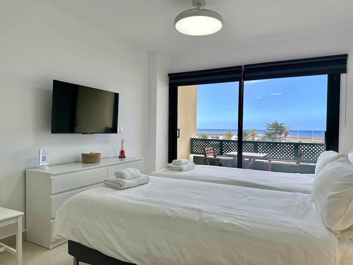 A room with a direct facade to the sea where you can enjoy the spectacular views and sunsets, in a very quiet pedestrian area, within a wonderful village where you will have among other services: public transport (bus, taxi), free public parking, restaurants, food shops, ambulatory (fifteen "15" minutes walk), hospital (twenty "20" minutes). Exceptional for resting. A five "5" minute walk will take you to Playa Jardín.