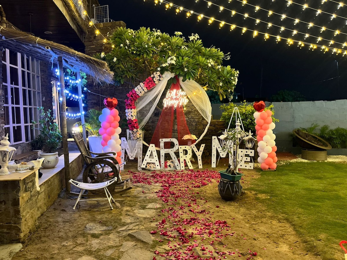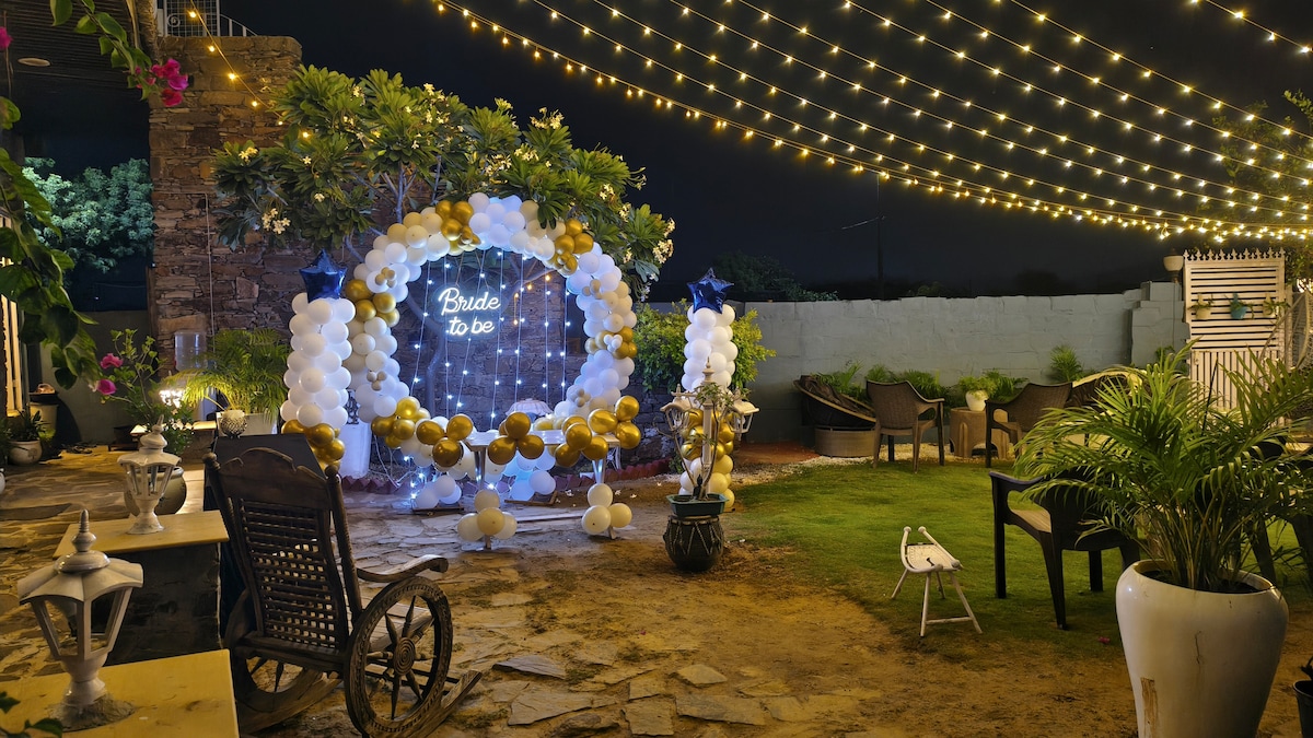 Escape to Aanandam Retreat, a peaceful 2-room luxury cottage in Ajmer with a private pool, green lawn, and rooftop machhan for sunrise views and stargazing. Guests love the blend of comfort and nature – cozy bedrooms with modern amenities, an outdoor kitchen for authentic cooking, and experiences like organic farming, bonfire nights, and lake treks. Pet-friendly and surrounded by greenery, it’s ideal for families, couples, and groups to relax, reconnect, and create lasting memories.