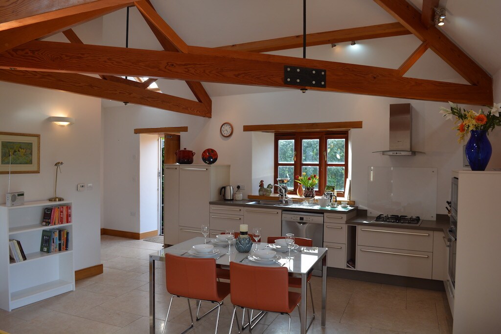 This stylishly converted old dairy has oak and beams and flooring and has beautiful far reaching views west towards Lyme Regis . It is perfect the perfect base for exploring this part of the beautiful Jurassic-coast, browsing around the Georgian market town of Bridport, fossiling in Lyme Regis and walking in the West Dorset’s Area Of Outstanding Beauty. Relax in the evening light out in the garden area looking over the fields and woods. Picnic is in the woodland with the bbq provided .