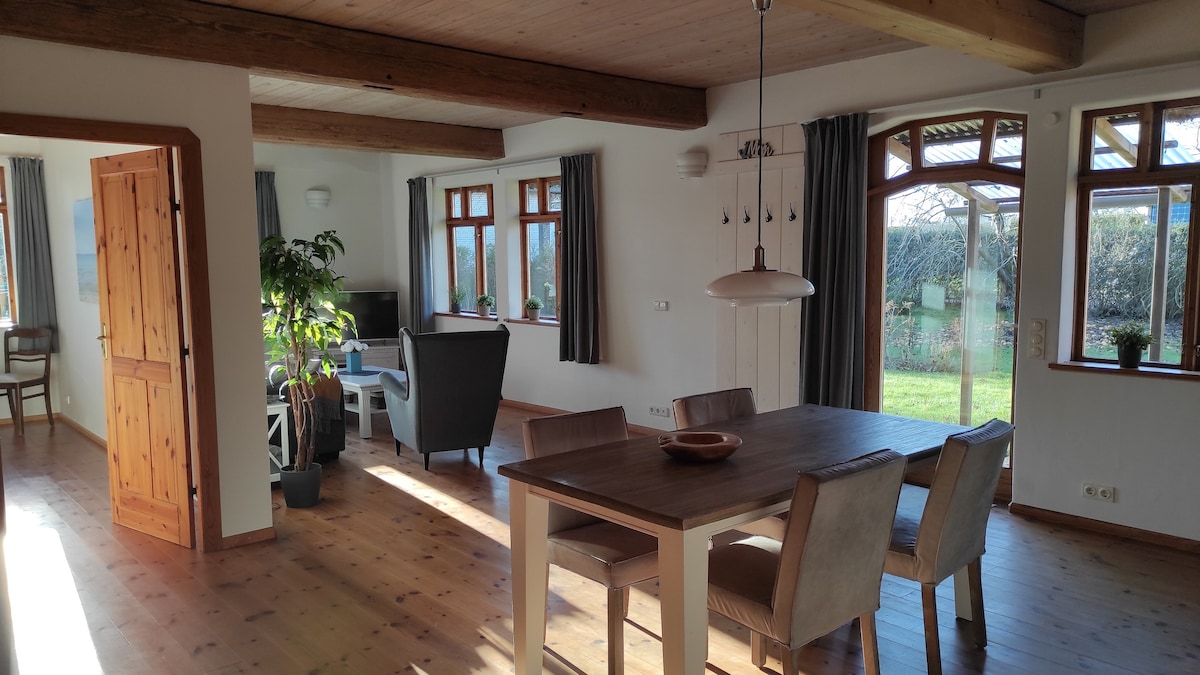 Charming country house in a secluded location to relax and feel good. The spacious vacation home offers four cozy bedrooms. An open plan living and dining area invites you to spend convivial evenings at the large kitchen table or on the sofa. The modern kitchen offers everything your heart desires: from various coffee machines, a variety of cooking appliances to the waffle iron or raclette, everything is available. At the back of the house is a garden with a terrace and views of nature.