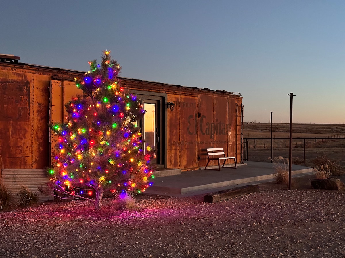 El Capitan is a combination of old and new. A 50+ year old train car that has been stylishly renovated. Modern amenities along with western decor. A large glass overhead door allows you to sit in the comfort of "home" while viewing the wide open spaces. And sunsets for miles!