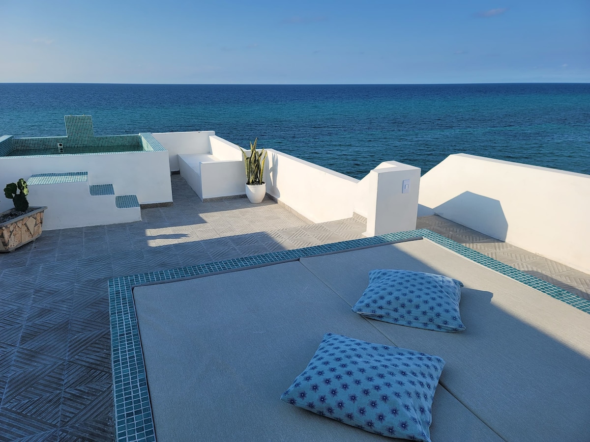 Small but characteristic apartment overlooking the ocean located in the authentic Santa Fe neighborhood. Characterized by a large panoramic terrace with a small Jacuzzi-sized pool overlooking the ocean and sunsets. The kitchen is equipped with a table, chairs, sofa, television and split. The double room has a king size bed and fan, there is a modern bathroom with a large shower and a service bedroom with two single beds. Patio with outdoor shower, table and sofa.