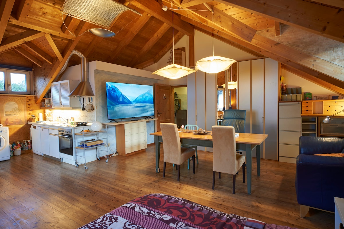 Very cozy attic with private kitchen, bathroom, living room, bedroom (33 sqm) with satellite TV, view over the rooftops (2nd floor) of the quiet residential area of Ramersdorf-Perlach in the southeast of Munich. In summer, my small garden is ideal for relaxing/eating in the countryside. You will live together with me and my little dog in a semi-detached house, whereby the attic is lockable. There is no water connection in the kitchen, but there is a sink for dishes in the bathroom.