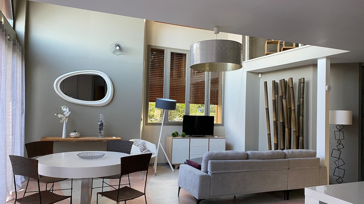 Ground floor apartment, air-conditioned, totally independent (self check-in) and includes a large bedroom: king size bed with 40" TV, a bathroom with toilet, open kitchen on a living room with a convertible sofa 1.60 m of good quality with memory foam. 1 Bay window overlooking an exterior. The property has 2 parking spaces in a closed courtyard (video). The property has a pond where it is possible to walk and see🦆🐿️ squirrels, we provide sheets and towels