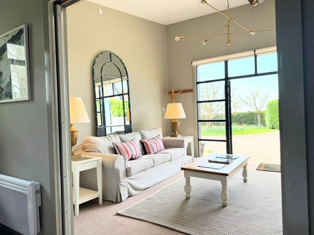 A private and extremely comfortable furnished converted barn in a quiet rural and beautiful setting. The barn has its own entrance with an open-plan sitting room and a fully equipped kitchen. Please let us know if you would like any breakfast, but we will leave milk tea and coffee. Comfortable double bedroom with en-suite bathroom and single room with ensuite upstairs. We can add an extra futon for a child in the single room so the whole space can fit a family of four.