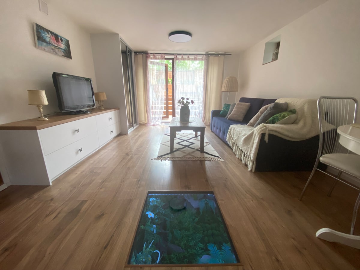 Visiting Wroclaw? Stay on the Big Island! 15min. to the center, in the heart of the Szczytnicki Park,surrounded by trees,close to the Oder River. An apartment with a separate entrance in a villa in the Śródmieście. Studio with a kitchenette and a bathroom, with a terrace and a garden surrounding the house. Centennial Hall and the ZOO approx. 7min. by car. 15-20min. to the center by bus or train. 15min. to the railway station.Grocery stores and shopping malls, swimming pools,tennis courts nearby.