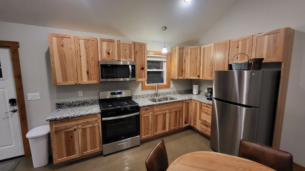 You don't have to be born in a barn to vacation in one. Trade in the city for millions of stars in the night sky! As you enter thru the French doors you will be greeted by an open concept room decorated with a barn/industrial motif. Knotty pine car-siding and galvanized steel, wood floors along with a reclining leather couch and love seat fill the room A full kitchen with granite counter tops await you. There is plenty of natural lighting for the evenings.