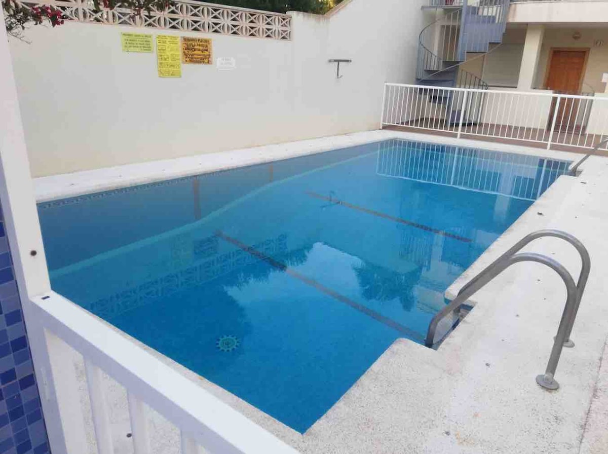 Stylish apartment with a nice terrace and ocean views. In a residential complex with a pool and very nice and well-kept common areas, and above all quiet. Very bright, spectacular terrace, spacious bedroom with 1.5x2m bed (new mattresses), kitchen with a pass-through, AA, fast Internet, 50" TV (YouTube, Prime, etc.). Close to all kinds of services: Beach 500m, supermarkets, pharmacy and restaurants less than 5min walk. Marina 10 minutes away, by promenade. Palacio de Congresos is a 15-minute walk away.