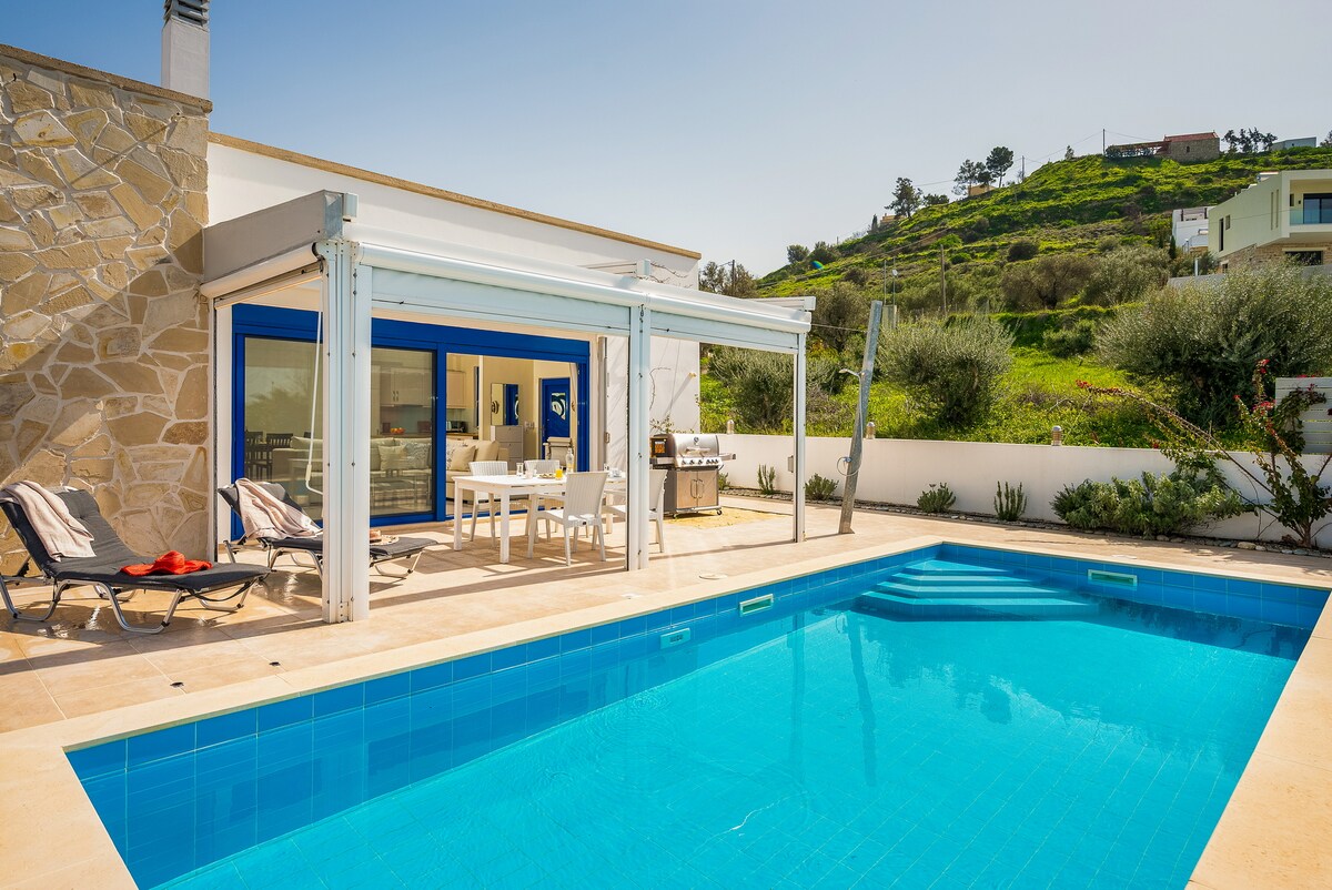 Unwind by your private pool, cook in the summer kitchen with BBQ and relax by the fire pit under the stars—all surrounded by nature and stunning views of the mountains, valley, and sea. Instead of tourist crowds, you'll experience real Cretan life: dine where the locals do, explore peaceful walking trails, and enjoy privacy in a truly sustainable, off-grid home. Sleeps 4 guests. 2 bedrms, 1 bath, fully equipped kitchen, A/C (Eco aircooler), Wifi, heated pool. 20min to beach. 20min to airport.