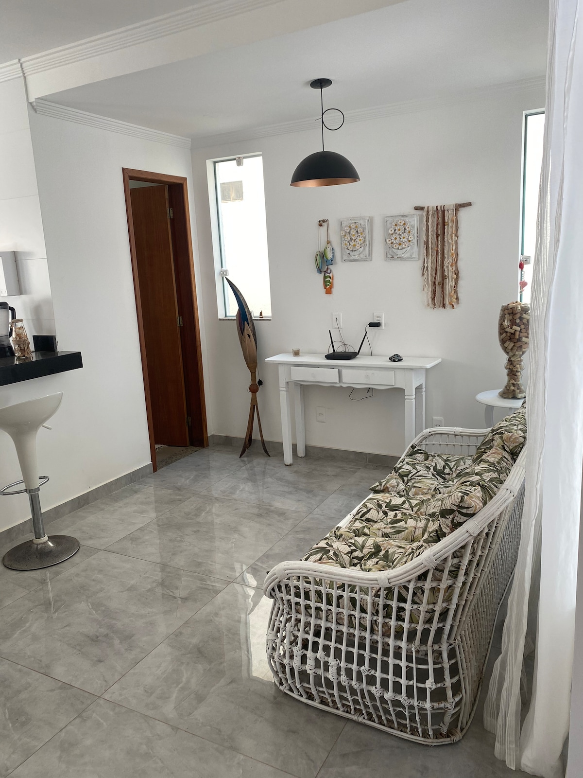Furnished, compact kitnet, facing the beautiful beach of Costa Azul in a condominium with barbecue and shower. It contains a combined bedroom and living room, kitchen, service area, bathroom and 1 parking space. Furniture: one bed and one sofa bed, both double, small wardrobe, 32" LCD TV, granite countertop with two stools, duplex refrigerator, cooktop stove, gas, microwave, ceiling fan and basic kitchen utensils. We have Wi-Fi, we don't have cable TV. No pets allowed.