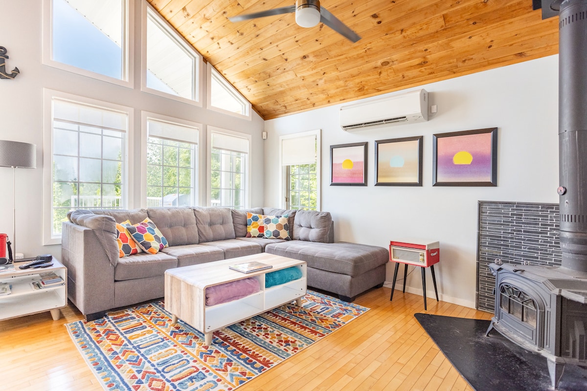 Modern relaxed lake front home with floor to ceiling windows giving you amazing waterfront views. Open bright layout with wood burning stove in the living room to warm up on chilly evenings. Fully equipped kitchen with dishwasher, microwave, oven and stove. Master bedroom has a king size bed with ensuite washroom. Second bedroom has queen size bed and third bedroom has 2 twin beds. There is also a main washroom with bathtub and shower. High speed fiber optic internet is available.