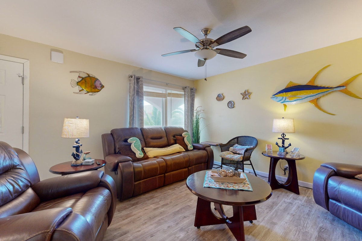 Relax at this peaceful waterfront vacation condo. Excellent location and stunning views. There are shops and eateries within walking distance. Enjoy the gorgeous sunsets from the balcony and experience coastal living. Family-friendly pool, boat trailer parking, private boat slip, and fish cleaning station. This lovely condo is close to the beach and other attractions. Enjoy fishing trips or fish directly from the dock.