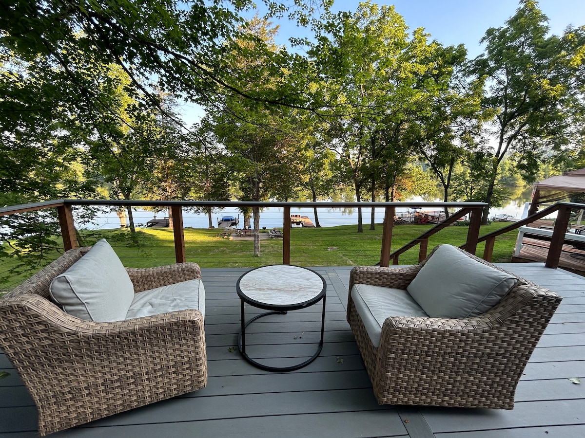 Unwind at this stunning remodeled work of art. Enjoy the hot tub and deck w/ 2 screen porches that have breathtaking lake views. The house was built with 2 separate living areas, high-beamed ceilings, and immaculate details for luxurious yet charming feel. The kids will enjoy the custom made bunk room in the basement with their own kitchen & living room area. Bring your boat or jet ski and enjoy the private boat ramp and dock. The kayaks, picnic area, & fire pit are yours to enjoy.
