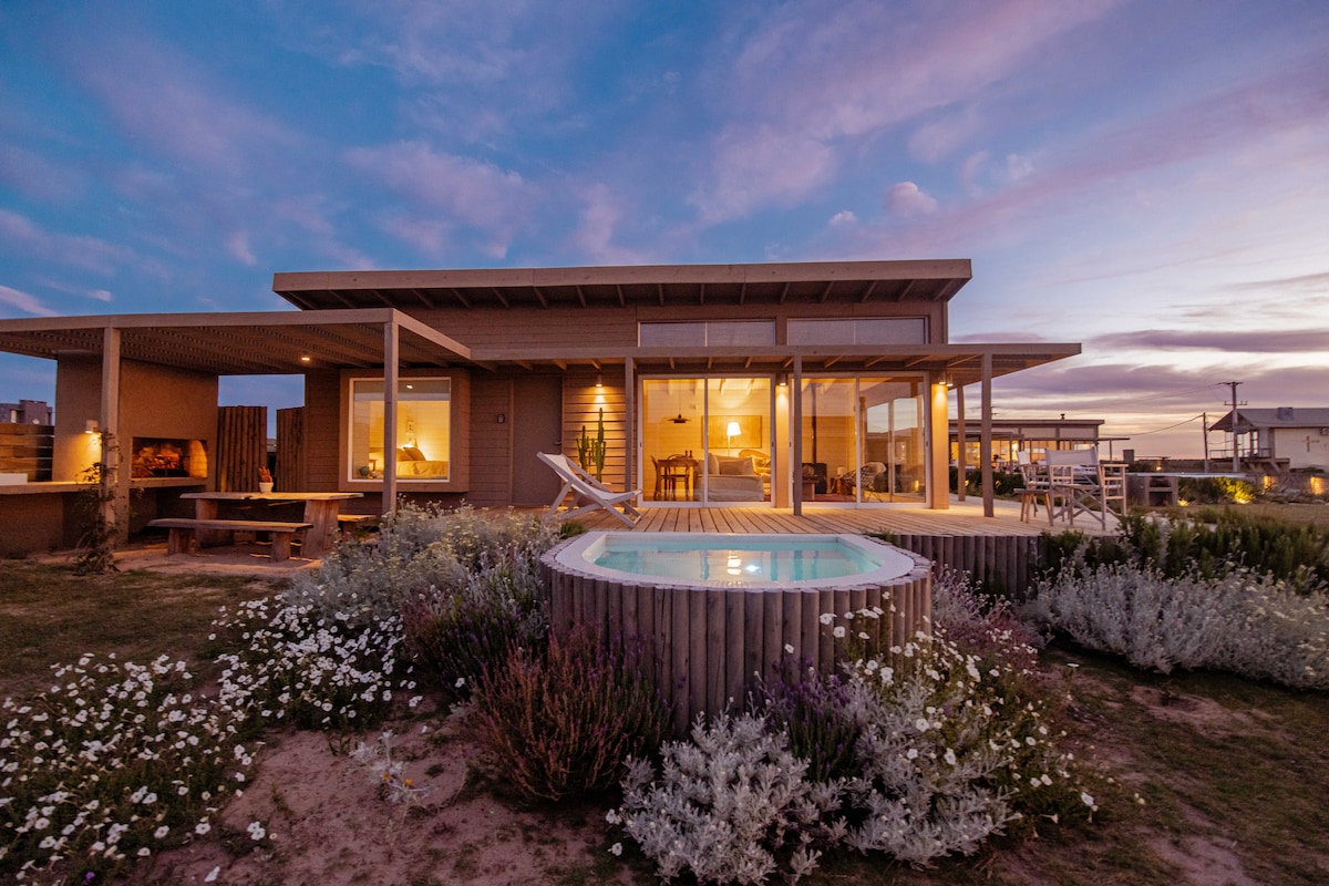 Beach and countryside house surrounded by magical nature. Located 13 km from La Pedrera and 21 km from Cabo Polonio. It has 2 bedrooms, 2 full bathrooms, a kitchen, a living room, an outdoor grill, a laundry room, and large decks with tables. Ocean views from the living room, kitchen, and both bedrooms. From the living room you can see the sunrise at sea, and from the dining room the sunset in the countryside.