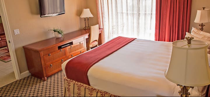 The One-Bedroom Deluxe Villa at Westgate Lakes Orlando Florida Resort offers an intimate setting with all the comforts of home. Enjoy the convenience of a fully equipped kitchen, living room, dining table, flat-screen TV's, a full bathroom with oversized jetted tub and separate walk-in shower, private washer/dryer, and a furnished screened-in balcony or patio.