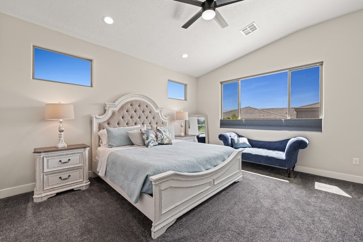 Bedrooms (sleeps 10 total): Our primary suite offers a king bed with attached bath, lounging couch, and a large walk in closet. The second primary bedroom has a king bed and an attached bath as well. A third bedroom offers a queen bed with a large closet. The fourth, another queen bed. In addition, we can sleep two more adults comfortably with our trifold foam mattresses in any living space. With all new and quality mattresses and comfy linens, you will have a great night's sleep after playing all day. Our mattresses and pillow are encased with a protective covering to keep you safe from unwanted elements. All bedrooms have smart TVs so that you can recline at night in privacy, should you choose. We have streaming capabilities but no local TV unless attached to your app.