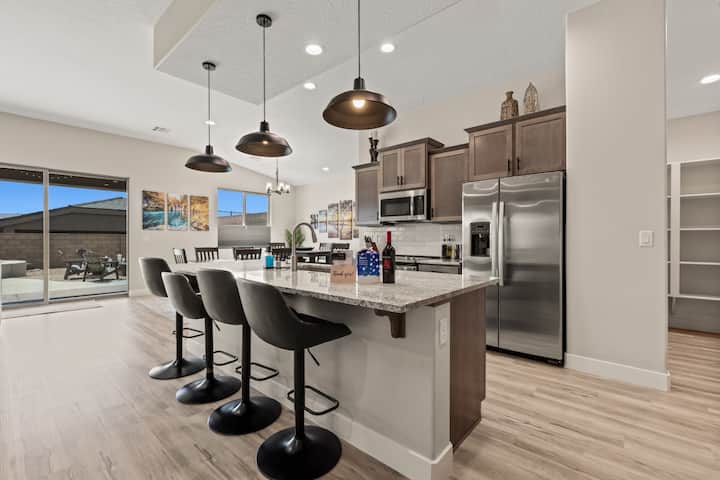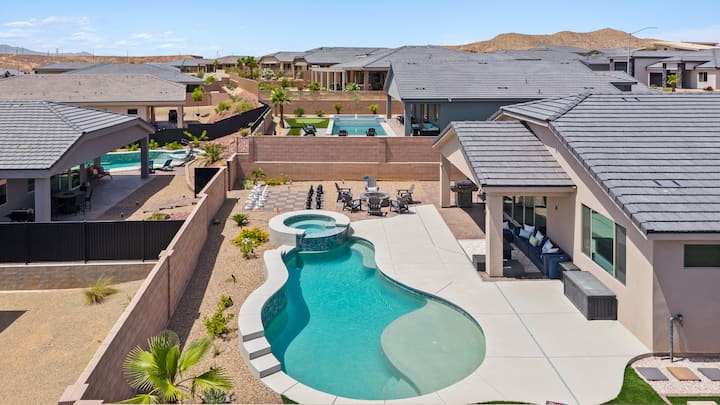 Indulge in luxury at this new 4-bed, 2-primary bedroom, 3 bath home. Stylishly furnished, it accommodates 10 with 6 beds. A pool and hot tub, giant chess game, fire pit, and lounge furniture and fire table add to the allure. Entertain at the bar, utilize the 2-car garage, and host more guests with an adjoining property and an additional one next to it! Experience modern living at its finest in this exquisite residence.