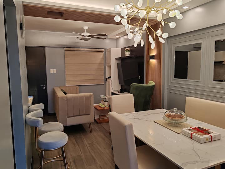 The unit is a fully furnished two-bedroom 64 sqm. at Asteria Residences. The master bedroom has a queen-sized bed while the other bedroom has 2 single beds with 1 pullout. Both bedrooms have wardrobe cabinets and aircon. The living/dining area has a split-type AC for your comfort. The kitchen has a small butler area and installed mini-pantry, and it is fully equipped with a ref, oven, rice cooker, mini toaster, and gas range. Enjoy watching movies on a 55-inch flat-screen TV in the living room.