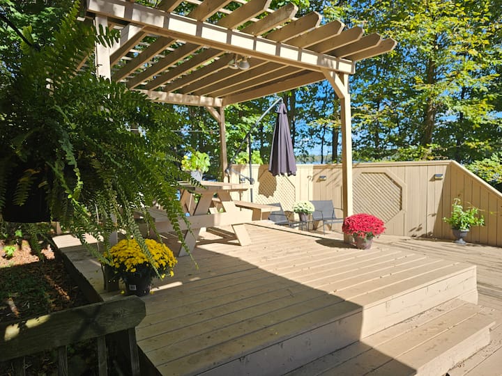 we have a HUGE deck that faces the water, perfect for children to play while parents BBQ, fantastic for dinners or space for everyone to lounge quietly. Different spots on the deck get both morning and afternoon sun while the whole deck is sun filled mid day.