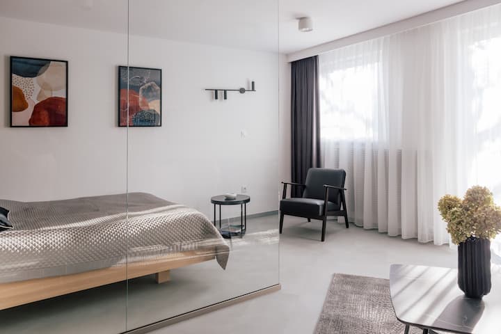 The place is for up to 4 people. A studio apartment consists of one living room connected to a bedroom with a double bed and a double sofa bed. Both of these zones are separated by a partially glass wall that creates a warm and intimate atmosphere. The apartment has a fully equipped kitchenette with a dining area and a bathroom with a shower. The equipment standard includes: