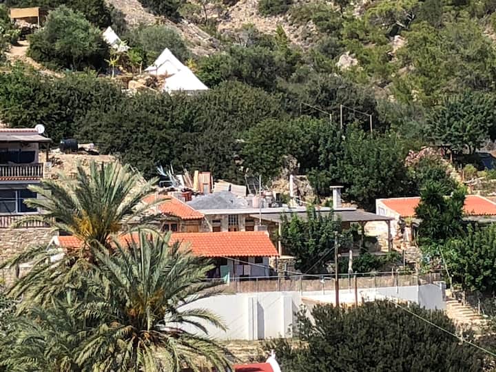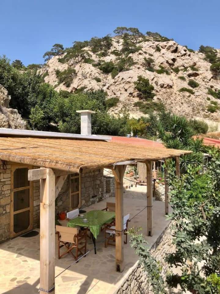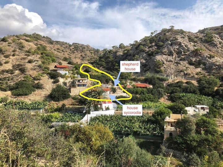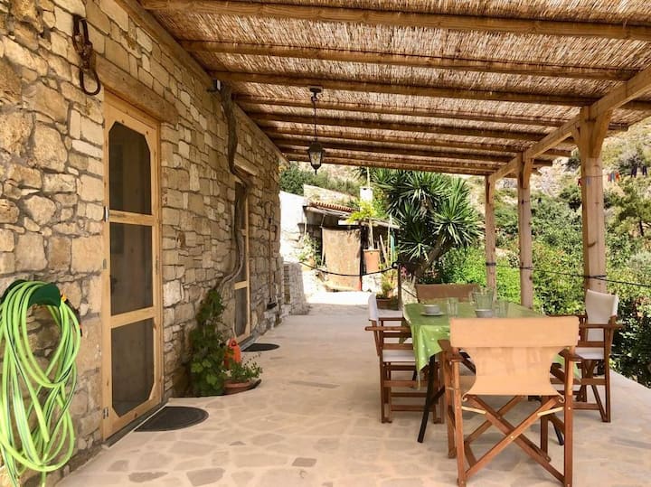 The former shepherd's house, about 400 m from the sea and the village of Tertsa, has a breathtaking view over the green valley with banana trees, fruit and vegetables to the village and the open sea.
