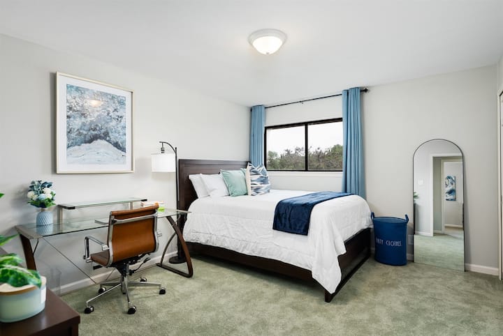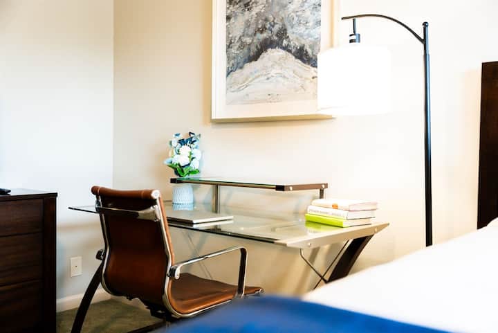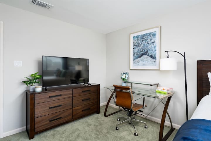 As your hosts, we offer a unique shared home experience, blending privacy with a warm and welcoming atmosphere. Each guest enjoys the comforts of a private room along with the personal amenities such as a dedicated desk and TV for your rest and relaxation. High-speed Wi-Fi ensures you stay connected, while our luxurious bedding featuring a queen size Tempur-Pedic mattress, down pillows, and down comforters promises a restful night's sleep. Plush towels and more await in your private sanctuary.