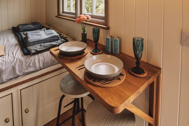 Our gorgeous Shepherds Hut is finished to the highest of standards with a kitchen, indoor modern shower room with mains water wc and it’s own large, fully enclosed garden area with a gas bbq, bistro table, fire pit, arm chairs and hammock.