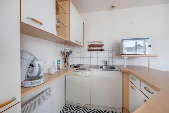 The open-plan kitchen with Tv lounge is equipped with 2 electric hobs, a combined microwave grill, a fridge-freezer, a dishwasher, a Senseo coffee maker, a kettle, a toaster and all the necessary kitchen equipment so that you feel at home. A bathroom with a hairdryer and a toilet completes the rental.
