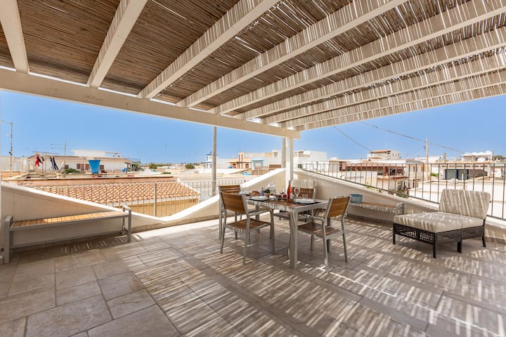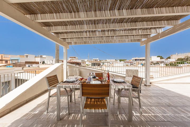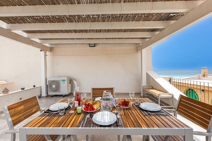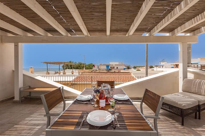 Villetta Playa del Sol is a vacation home for groups of up to 7 people, a few meters from the beach in San Pietro in Bevagna, with a sea-view terrace and amenities such as air conditioning, washing machine, dishwasher and coffee maker.