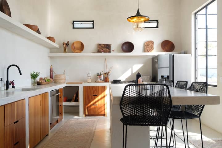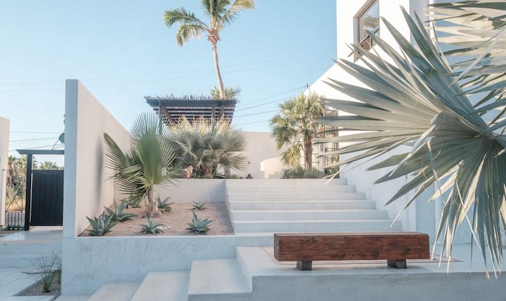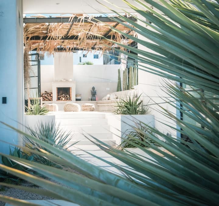 Welcome to our upscale bed and breakfast in Todos Santos, where luxury meets tranquility. A five-minute walk to the beach, our charming retreat offers stunning ocean views and a serene atmosphere for relaxation. Our boutique B&B features 3 elegantly appointed bedrooms, a shared kitchen for leisurely breakfasts. Enjoy sunsets from the rooftop terrace, and unwind by the fireplace. Experience the perfect blend of natural beauty, elegance & comfort at Ojos Azule your oceanfront home away from home.