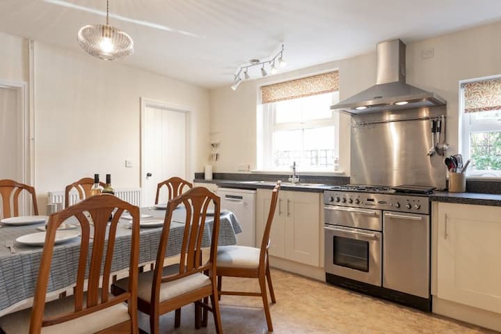 Kitchen/Dining Area: Rangemaster dual fuel range cooker with 5-ring gas hob, gas grill, electric and gas oven, dishwasher, oval dining table and chairs.